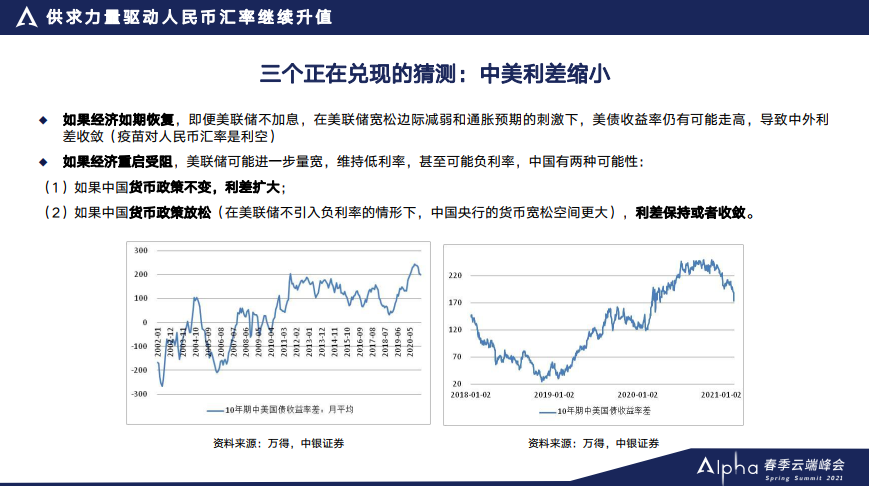 比方说中美利差比较大,被市场认为是吸引外资流入,支持人民币升值的一个重要因素。但在今年年初的时候我就说了,去年中美利差比较大,有一定的特殊性,今年的话在基准情形下,随着疫情得到控制,即便美联储不会马上加息,但是通胀预期抬头也可能会推高美债收益率,并导致中美利差收敛。