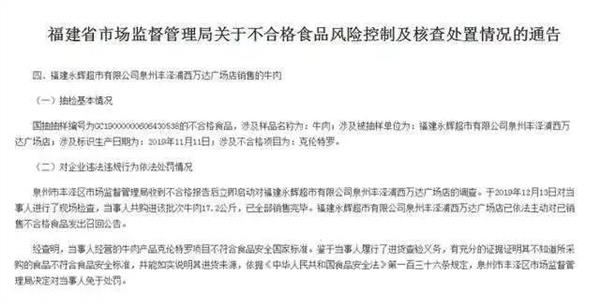 除上述内容外,福建省市场监督管理局网站于6月9日公布的《福建省市场监督管理局关于不合格食品风险控制及核查处置情况的通告》显示,福建永辉超市有限公司泉州丰泽浦西万达广场店销售的牛肉抽查不合格。泉州市丰泽区市场监督管理局于2019年12月13日对福建永辉超市有限公司泉州丰泽浦西万达广场店进行了现场检查,该店共购进该批次牛肉17.2公斤,已全部销售完毕。福建永辉超市有限公司泉州丰泽浦西万达广场店已依法主动对已销售不合格食品发出召回公告。 内容来自dedecms