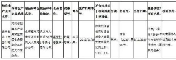 其中,永辉超市河南有限公司巩义人民路分公司销售的标称麦丰食品(中国)有限公司生产的1批次蒸爱奶香蛋糕,防腐剂混合使用时各自用量占其最大使用量的比例之和检出值为1.13,标准规定为不大于1。该蛋糕规格型号为散装称重,商标为三只果。生产日期/批号为2019年11月20日,分类为糕点,检验机构为河南国德标检测技术有限公司。
