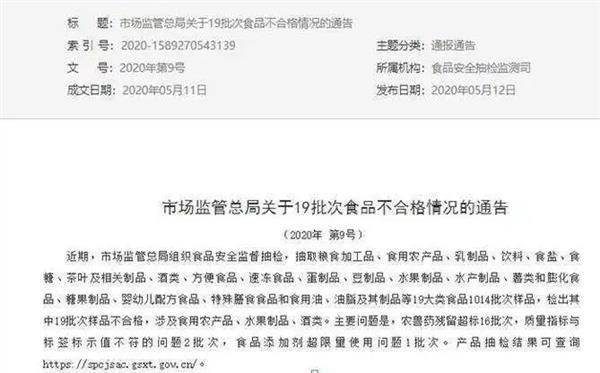 去年5月12日,市场监管总局发布关于19批次食品不合格情况的通告(2020年第9号)显示,市场监管总局对粮食加工品、食用农产品、水产制品等重点食品组织安全监督抽检。在全国抽检19大类食品1014批次样品。抽样检验项目合格样品995批次,不合格样品19批次。不合格样品涉及食用农产品、水果制品、酒类。主要问题是,农兽药残留超标16批次,质量指标与标签标示值不符的问题2批次,食品添加剂超限量使用问题1批次。 内容来自dedecms