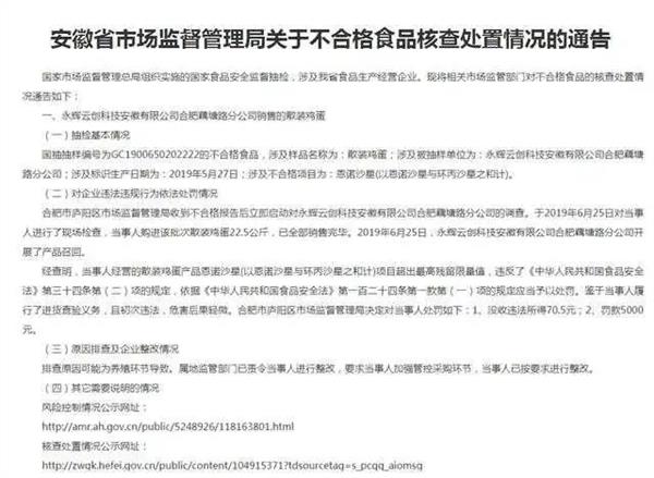 此外,安徽省市场监督管理局网站曾于去年6月10日公布的《安徽省市场监督管理局关于不合格食品核查处置情况的通告》显示,国家市场监督管理总局组织实施的国家食品安全监督抽检,涉及安徽省食品生产经营企业。