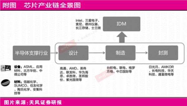 华通表示,芯片产业链又可以分为五个关键环节,芯片设计(fabless,包括韦尔股份、卓胜微、兆易创新等)、芯片制造(foundry,包括中芯国际、华虹半导体等)、芯片设计制造一体化(IDM,包括华润微、士兰微等)、芯片上游材料(包括沪硅产业、立昂微等),芯片下游封测(包括长电科技等)。 织梦好,好织梦