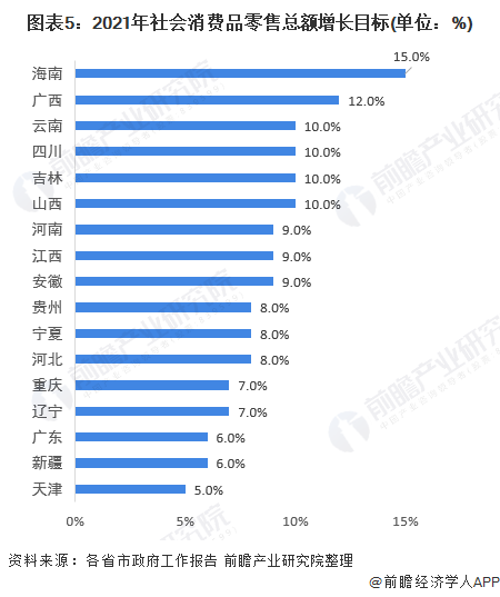 社会消费品零售总额可以反应一定时期人民物质文化水平的发展情况,也是地区人民物质文化生活富足的重要指标体现,故此在2021年政府工作报告中,多地披露了该指标。目标中,海南、广西、云南、四川、吉林、山西社会消费品零售总额目标均超过10%,海南省最高为15%。 织梦内容管理系统