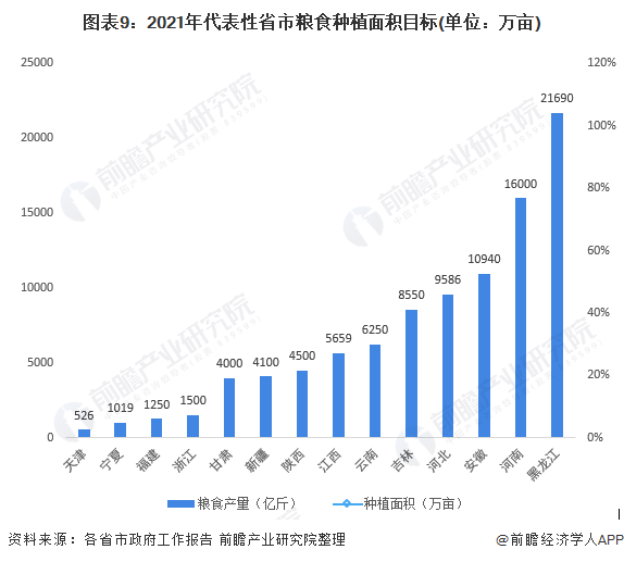 2021年稳定粮食播种面积,严守国家18亿亩耕地红线,其中黑龙江省作为我国第一产量大省,2021年规划粮食种植面积粮食播种面积达2.169亿亩。河南省及安徽省粮食种植面积也均超过1亿亩。除此之外,各省市在2021年致力于粮食种植面积稳定,粮食单产及品质明显提升。 dedecms.com