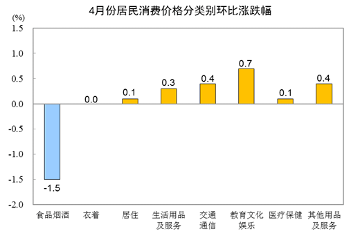 从环比看,CPI下降0.3%,降幅比上月收窄0.2%。其中,4月食品价格下降2.4%,降幅收窄1.2%,影响CPI下降约0.45%。食品中,随着生猪生产持续恢复,加之消费需求有所回落,猪肉价格继续下降11.0%;鲜菜和鲜果上市量增加,价格分别下降8.8%和3.8%;受供给减少及饲料成本上涨等因素影响,淡水鱼价格上涨9.8%。