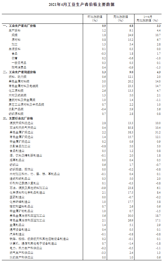 中国4月全国工业生产者出厂价格(PPI)同比上涨6.8%,涨幅为2017年以来最大,超过前值4.4%,环比上涨0.9%;工业生产者购进价格同比上涨9.0%,环比上涨1.3%。1—4月平均,工业生产者出厂价格比去年同期上涨3.3%,工业生产者购进价格上涨4.3%。