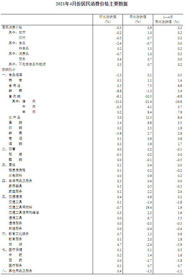 5月11日,国家统计局公布数据显示,4月中国全国居民消费价格(CPI)同比上涨0.9%,前值上涨0.4%;环比下降0.3%,降幅比上月收窄0.2%。 内容来自dedecms