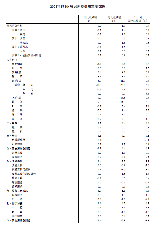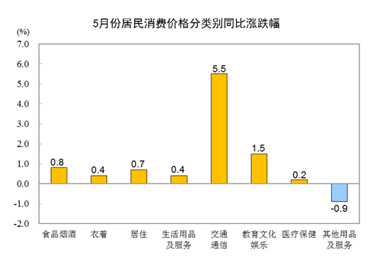 5月份,食品烟酒类价格同比上涨0.8%,影响CPI(居民消费价格指数)上涨约0.24个百分点。食品中,蛋类价格上涨14.3%,影响CPI上涨约0.08个百分点;水产品价格上涨13.8%,影响CPI上涨约0.25个百分点;鲜菜价格上涨5.4%,影响CPI上涨约0.10个百分点;鲜果价格上涨1.4%,影响CPI上涨约0.03个百分点;粮食价格上涨0.8%,影响CPI上涨约0.01个百分点;畜肉类价格下降11.3%,影响CPI下降约0.46个百分点,其中猪肉价格下降23.8%,影响CPI下降约0.50个百分点。