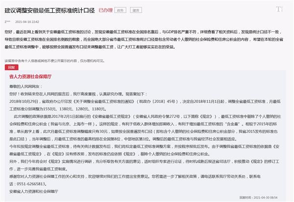 4月30日,安徽省人力资源社会保障厅回复上述网友称,安徽省近几年最低工资标准调整的政策依据是2017年2月1日起施行的《安徽省最低工资规定》(安徽省人民政府令第272号,以下简称《规定》),最低工资标准中剔除了个人缴纳的社会保险费和住房公积金(安徽省与北京、上海市一样)。这样的规定,有利于低收入群体增加即期收入,有利于增加最低工资标准的“含金量”。