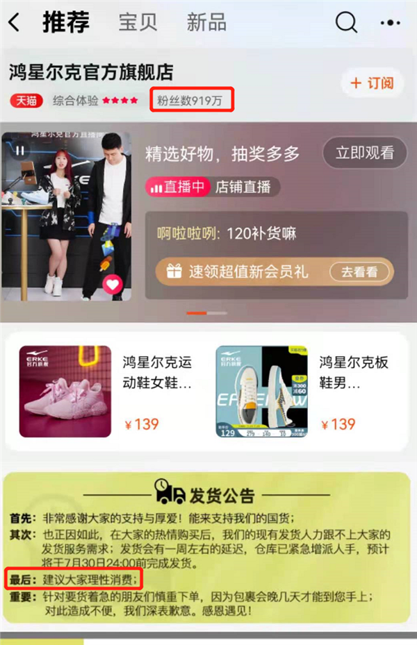 最新数据显示,鸿星尔克淘宝旗舰店粉丝突破900万,首页表示由于发货人力跟不上,会有一周左右的延迟。还特别建议大家理性消费。 织梦好,好织梦