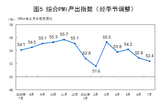 7月份,综合PMI产出指数为52.4%,比上月回落0.5个百分点,表明我国企业生产经营活动扩张速度有所放慢。