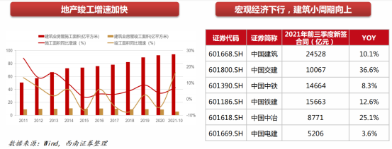 以房屋新开工面积增速和竣工面积增速表现的建筑业周期则较为显著,按照这一标准,建筑业小周期长度大约为2-3年,2021年竣工加速,叠加未来政策预期地产端未来增速或将下行。今年上半年以来,大型建筑央企新增订单整体仍保持较好的增长,近年来建筑央企、国企订单情况良好,预计未来几年具有较好的经营空间。