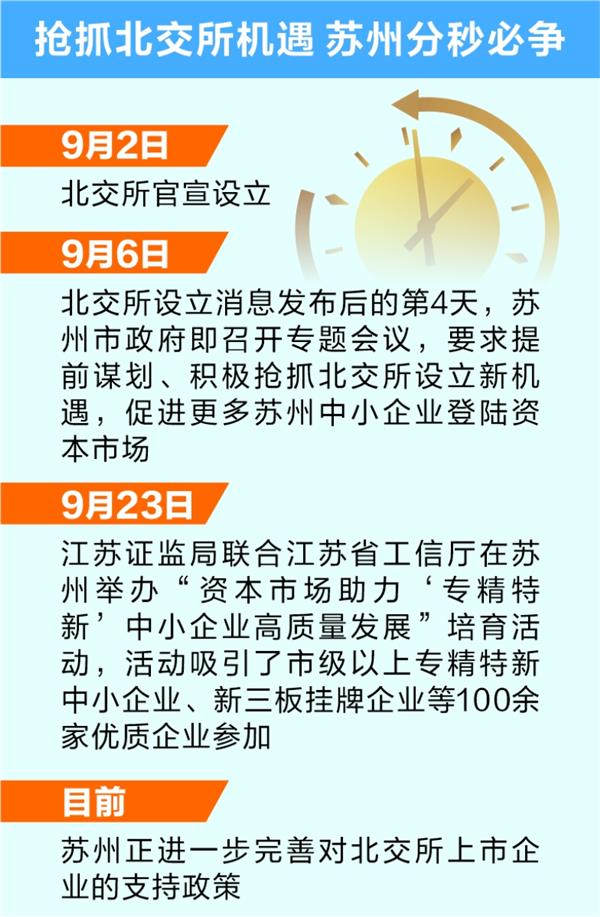 为加速对接北交所,9月6日,北交所设立消息发布后的第4天,苏州市政府即召开专题会议,要求提前谋划、积极抢抓北交所设立新机遇,促进更多苏州中小企业登陆资本市场;今年9月23日,江苏证监局联合江苏省工信厅在苏州举办“资本市场助力‘专精特新’中小企业高质量发展”培育活动,活动吸引了市级以上专精特新中小企业、新三板挂牌企业等100余家优质企业参加。 本文来自织梦