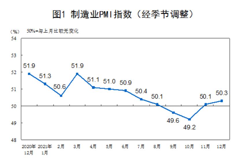 12月制造业PMI为50.3%,比上月上升0.2个百分点