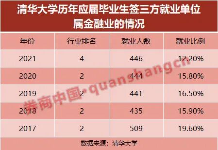 从单位所属行业来看,2021年去金融业就业的清华学子共有446人(本科生、硕士生、博士生数据合计),金融业就业比例为12.2%。在行业分布来看,上述两项指标排在第4位,较往年出现下滑。