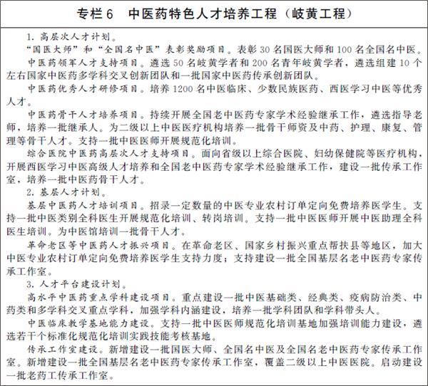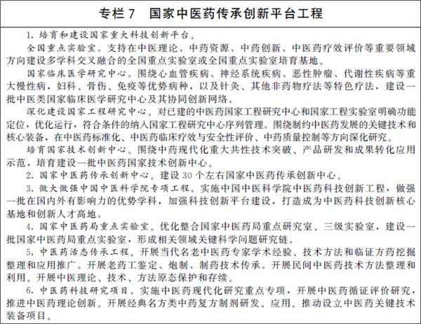 1.加强中医药传承保护。实施中医药古籍文献和特色技术传承专项,编纂出版《中华医藏》,建立国家中医药古籍和传统知识数字图书馆。加强对名老中医学术经验、老药工传统技艺等的活态传承,支持中医学术流派发展。推动出台中医药传统知识保护条例,建立中医药传统知识数据库、保护名录和保护制度。 dedecms.com