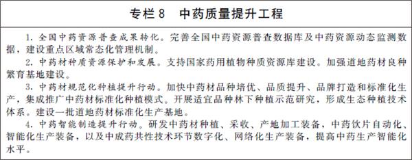 1.加强中药资源保护与利用。支持珍稀濒危中药材人工繁育。公布实施中药材种子管理办法。制定中药材采收、产地加工、野生抚育及仿野生栽培技术规范和标准。完成第四次全国中药资源普查,建立全国中药资源共享数据集和实物库,并利用实物样本建立中药材质量数据库,编纂中国中药资源大典。