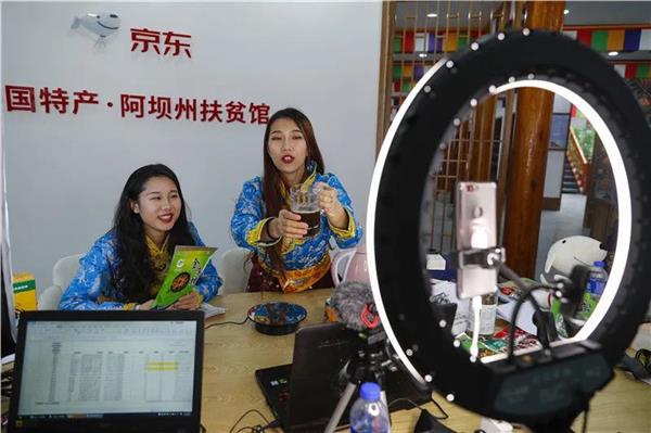 在四川省阿坝藏族羌族自治州松潘县的“中国特产·阿坝州扶贫馆”里,两名主播通过直播平台,帮助松潘当地企业直播销售沙棘饮料等特产(2020年6月17日摄)。新华社记者 沈伯韩 摄 copyright dedecms