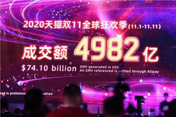 在浙江杭州未来科技城学术交流中心,大屏幕显示阿里巴巴旗下天猫“双11”成交额超过4982亿元(2020年11月12日摄)。新华社记者 黄宗治 摄 织梦好,好织梦