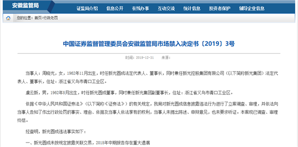 2019年12月31日,安徽证监局发布的市场禁入决定书显示,周晓光、虞云新夫妇担任ST新光董事、实际控制人期间,其指使、安排新光集团非经营性占用上市公司资金的关联交易事项、上市公司违规担保事项、共同借款事项,不履行信息披露义务,情节严重。依据相关规定,二人被安徽证监局采取10年证券市场禁入措施。 本文来自织梦