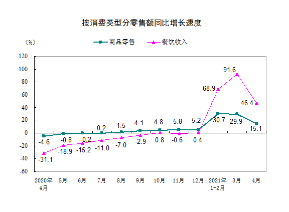 按消费类型分,4月份,商品零售29776亿元,同比增长15.1%,两年平均增长4.8%;餐饮收入3377亿元,增长46.4%,两年平均增长0.4%。 copyright dedecms