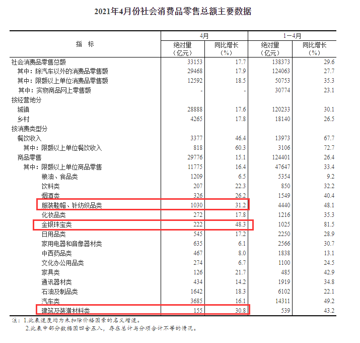 1-4月份,商品零售124401亿元,同比增长26.4%,两年平均增长4.8%;餐饮收入13973亿元,增长67.7%,两年平均下降0.7%。